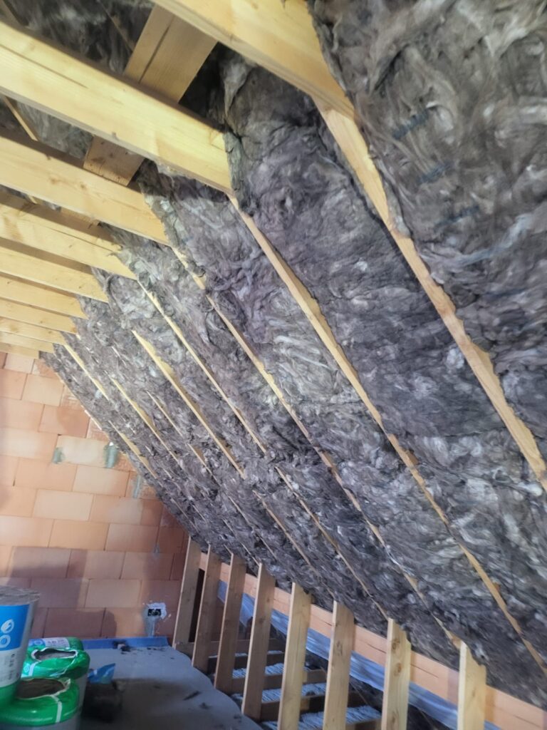 Het dak van deze nieuwbouwwoning werd geïsoleerd met 22cm minerale wol van Knauf. Dit type isolatie heeft vele voordelen: gunstig brandattest, geen chemisch bindmiddel… Nadien werd het geheel afgewerkt met een dampscherm. De naden werden afgetapet en de aansluiten aan de muren luchtdicht gesiliconeerd. Tot slot werden plafondlatten geplaatst zodat de gyplatplaten aangebracht kunnen worden.