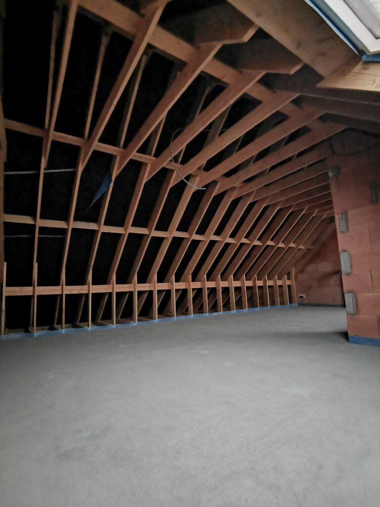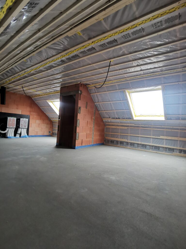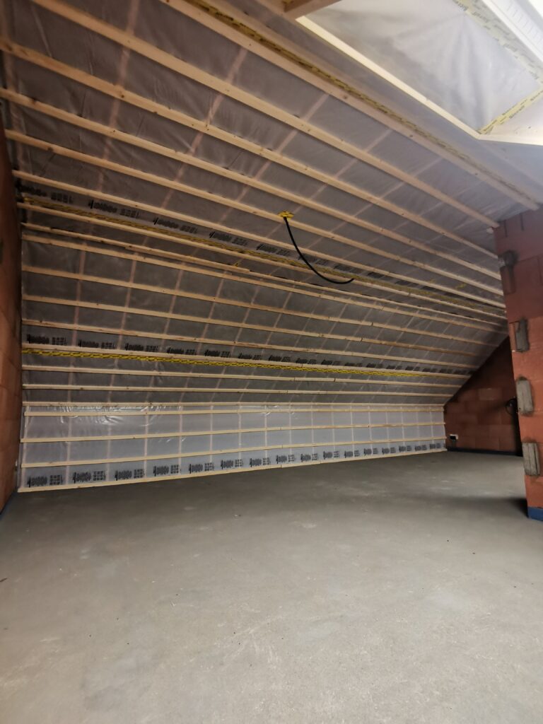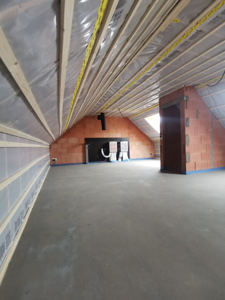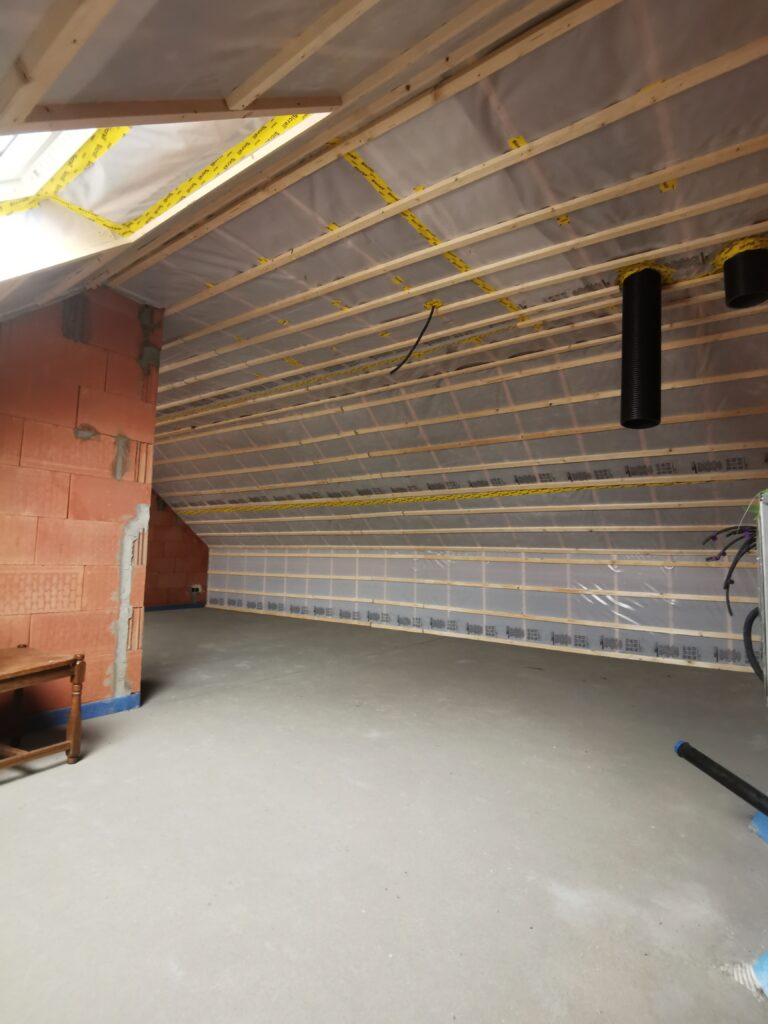 Het dak werd aan de binnenzijde lucht- en dampdicht afgewerkt met een dampscherm. De bewoners zullen geen last hebben van een te hoge energiefactuur of oververhitting in de zomermaanden. Deze zolder staat klaar om afgewerkt te worden.