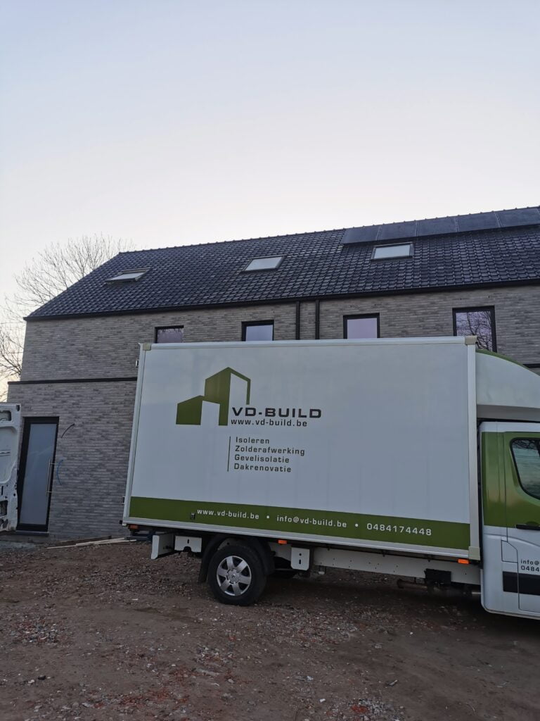 Deze halfopen nieuwbouwwoning werd door VD-Build voorzien van dakisolatie aan de binnenzijde. De spanten werden opgevuld met 22cm minerale wol van Knauf (Multifit035) met lambda-waarde 0,035m²K/W. Hiermee voldoet de woning aan de opgelegde isolatie-eisen.