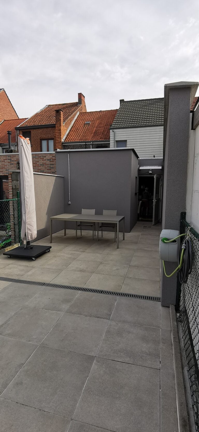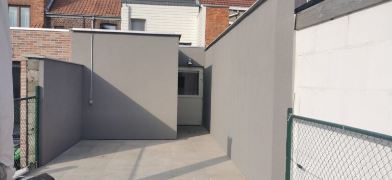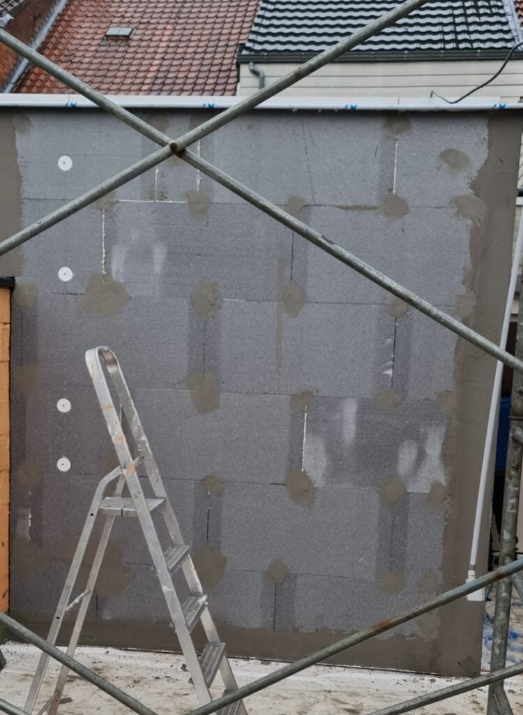 De bestaande buitengevel van de badkamer werd gereinigd en geïsoleerd met 14cm EPS isolatie. Daarna werd de isolatie afgewerkt met een siliconenharspleister in donkergrijze kleur.