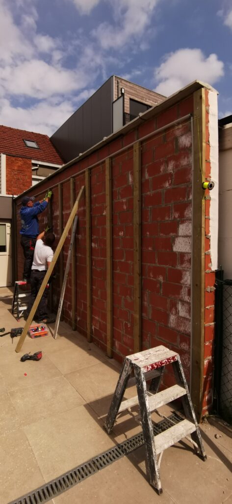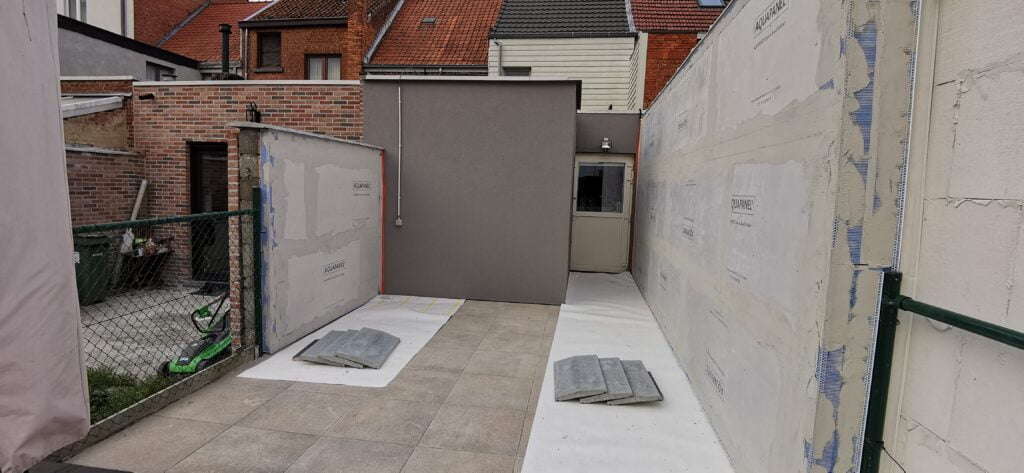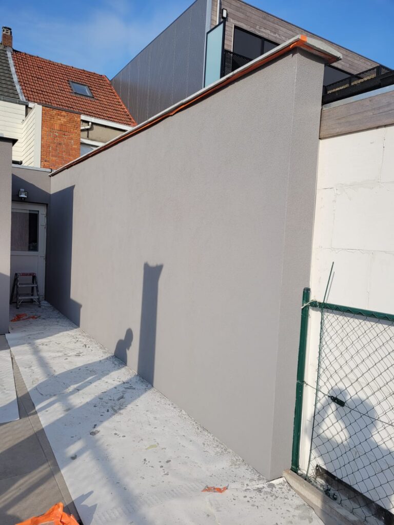 De tuinmuren werden ontkoppeld door middel van een houten regelstructuur met Knauf Aquapanel geschroefd op de regelstructuur. Daarna werden de tuinmuren afgewerkt met een siliconenharspleister in donkergrijze kleur.