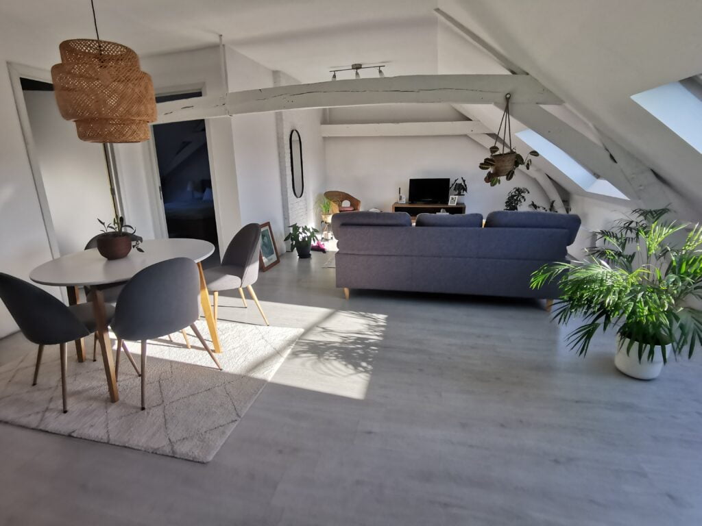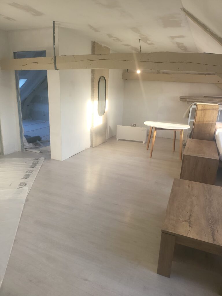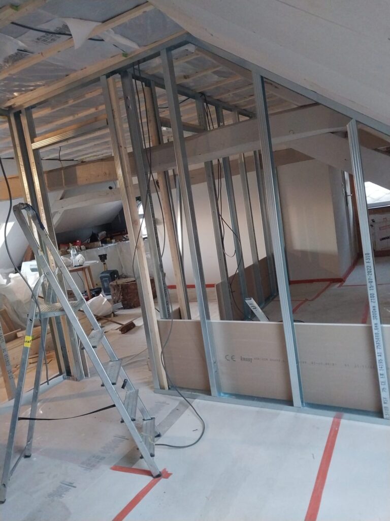 Eerst werd de volledige loft leeggemaakt en beschermd om de afbraakwerken aan te kunnen vatten. De bestaande afwerking werd verwijderd. Er werd een onderdak ingevlochten tussen de kepers om de isolatie te beschermen van neerslag die onder de leien kon komen. Dit onderdak zorgt ook voor een betere winddichtheid. Nadien werd het dak uitgedikt in functie van extra isolatiedikte en vlakheid der gebinte. Tot slot werd de woning geïsoleerd naar de huidige standaarden en opnieuw afgewerkt.